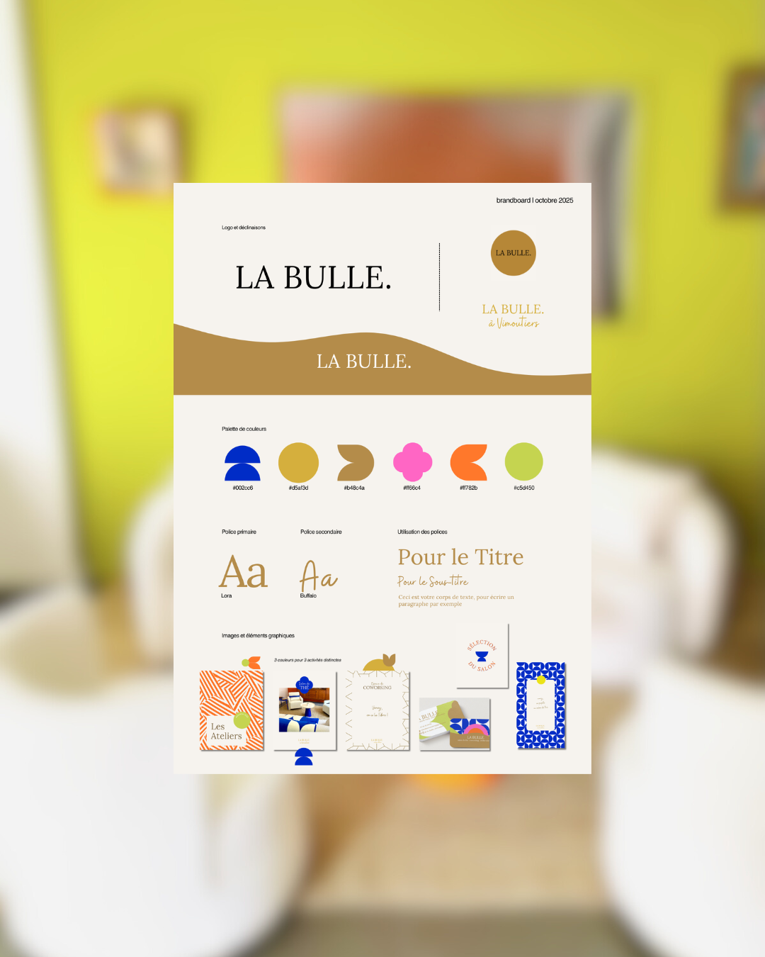 Voici la Brandboard, un document que je fournis à mes clientes pour faire un récapitulatif et donner les lignes directrices artistiques. C'est cette brandboard qui permet de décliner l'identité visuelle sur :